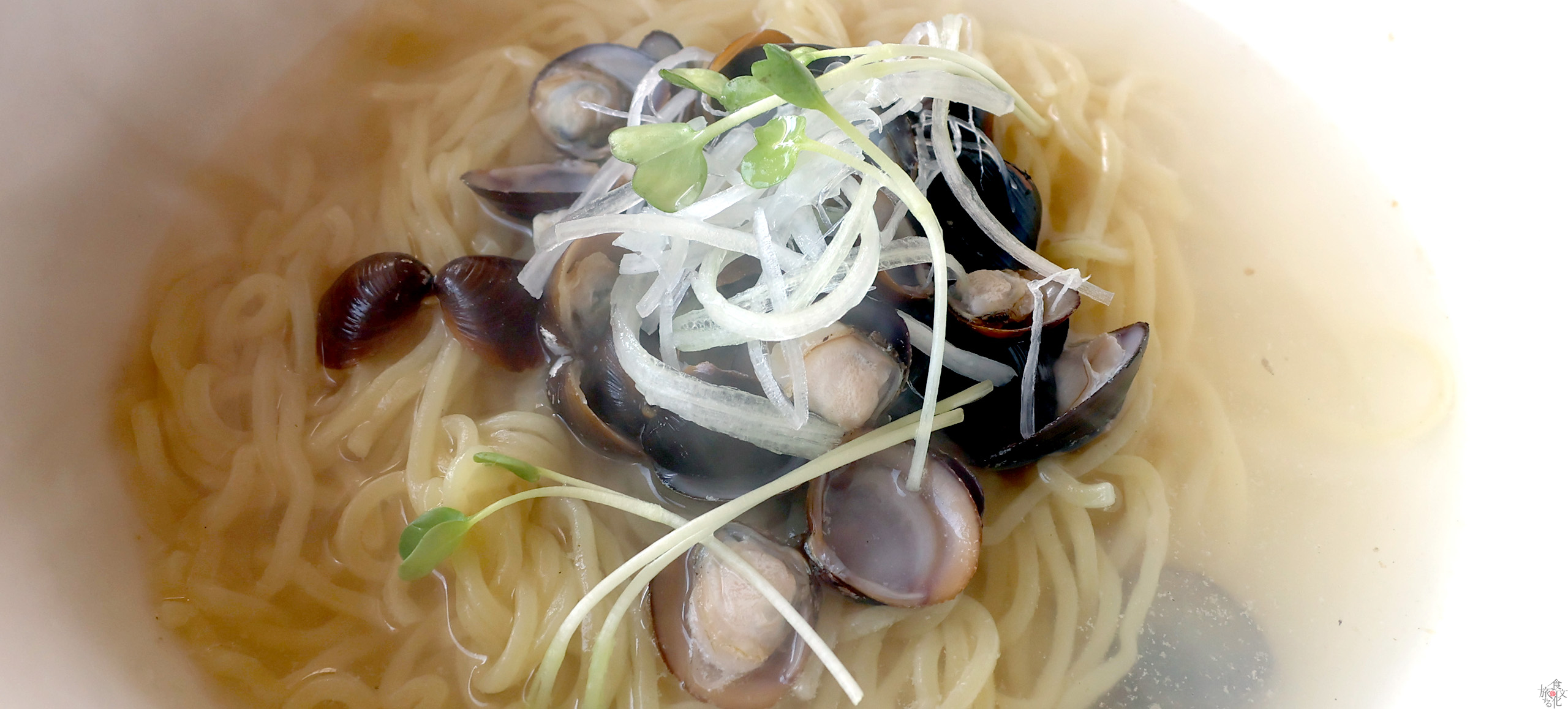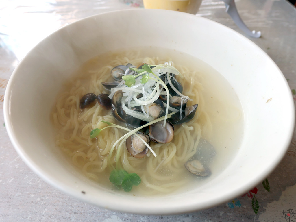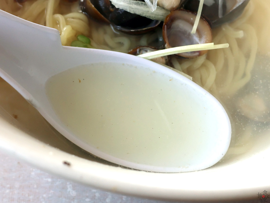 スープは驚くほど透明だ。しじみならではの深いだしの味わいを楽しむためだろう、余計な手が入っていないのだ。塩味も薄め、少し胡椒を感じるくらいで、しじみのうまみそのものを蓄えたスープだ。ひとくちすすると思わずうなってしまう。麺も細めのくせのない麺だ。あくまで主役はしじみのうまみと言っていいだろう。