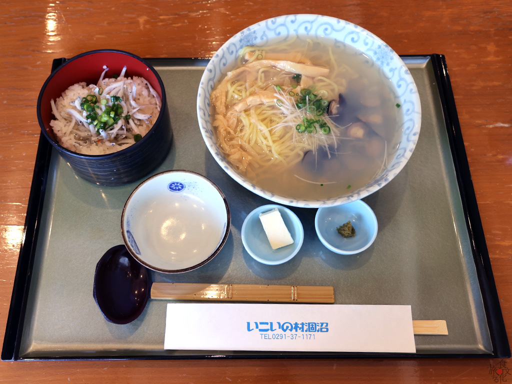 「レストラン憩い」のしじみラーメンは限定10食とのこと。しばらくロビーで待たされたが、何とか食べることができた。しらすご飯とのセットになっていた。登場したしじみラーメンの見た目は、ほぼ「やちべえ」と一緒。メンマがのっていたのが違いだろう。しじみのだしを生かした薄味のスープも一緒だった。