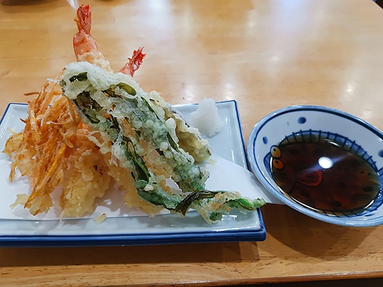 こちらではサクサクの衣で天丼が人気と聞き、天ぷらをいただくことにしました。その軽い食感が何ともいい歯ごたえで、だしの効いたつゆの香りが食欲をそそります。