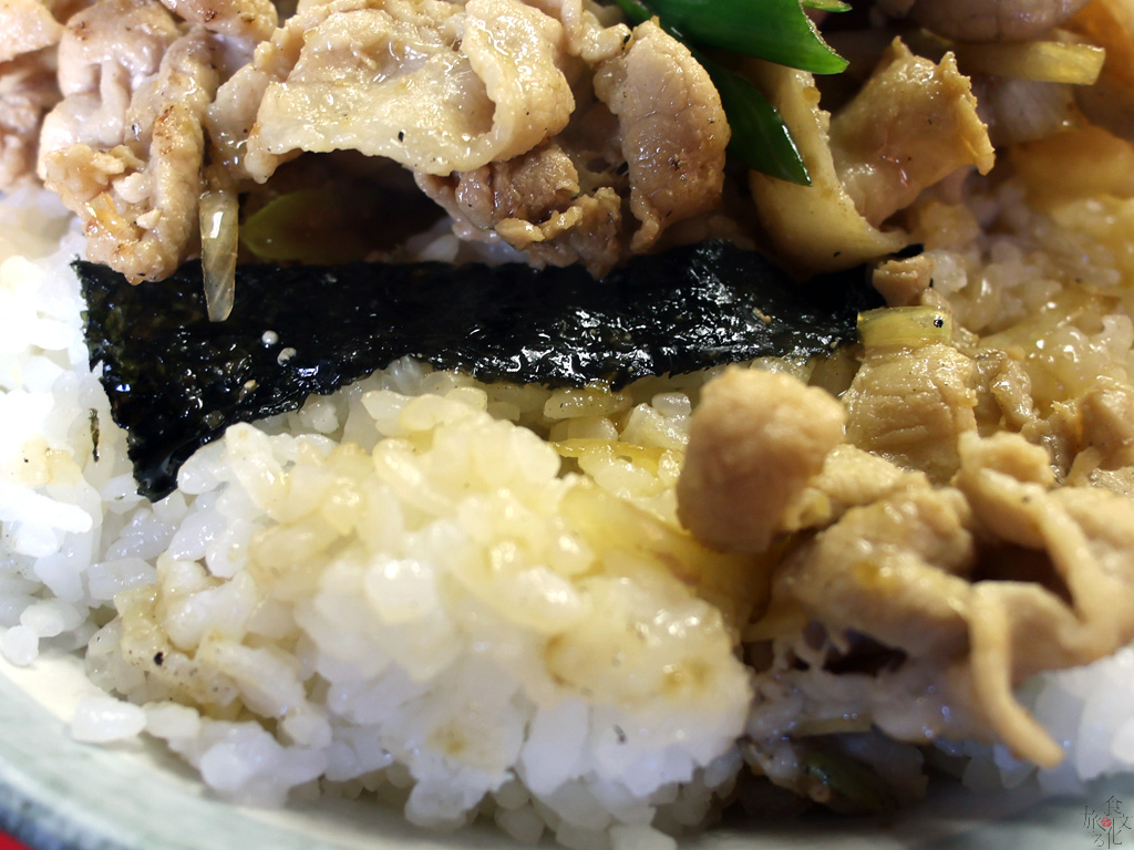 肉はチェーン店よりやや厚めに感じた。バラ肉ながら、赤身部分に結構歯ごたえがある。ねぎもチェーン店に比べ存在感が高い気がした。肉とご飯の間には海苔。これはチェーン店でも継承されている。ニンニクしょうゆ味の刺激的な豚バラ炒めの中に、時折海苔の味が挟まるといいアクセントになる。