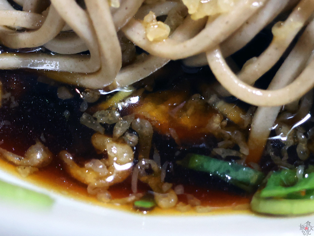 老舗のそば店だけにそばの美味しさが光る。つゆは見るからに濃い。しかし、事前に予想していたほど甘くはなかった。ほんのり甘い程度だ。ボリュームは控えめだったが、常連客からはダブルやうどんとの相盛りを頼む声が多く聞こえた。老舗らしく結構お年を召した方も多かったのだが、みんな冷やしたぬきそば好きのようだ。