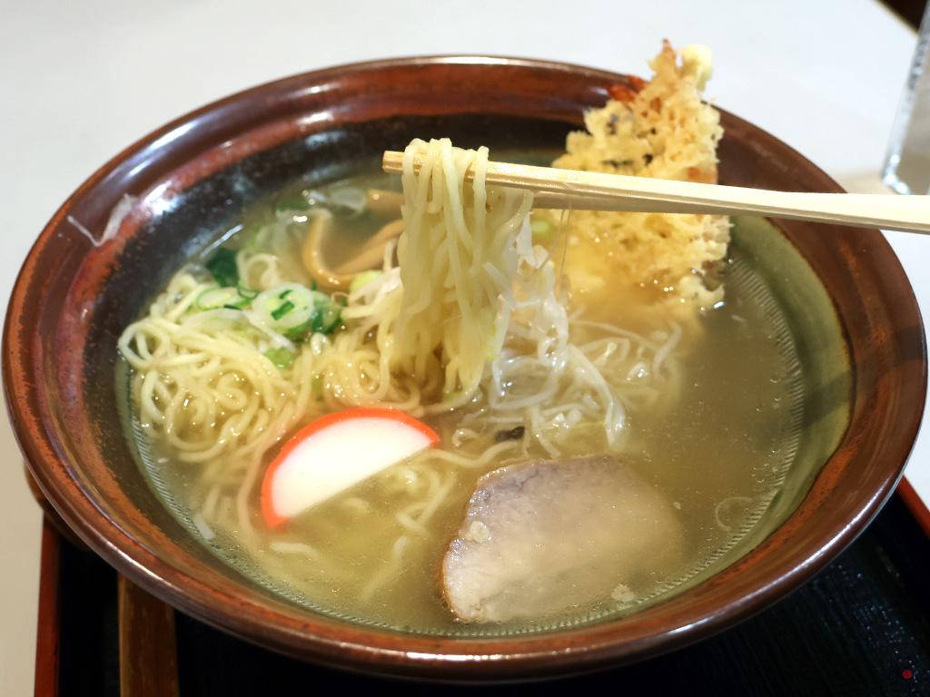 まずは、古くから天ぷら中華を扱う老舗食堂「志のだや」を訪れた。ラーメンと言えば、チャーシューがつきものだが、海老の天ぷらと中華麺がこれほどまでに相性がいいというのは驚きでもある。その橋渡しをするのがあっさりとしたスープの存在だ。薄味で透明度が抜群で、ラーメンスープというよりは、そばだしに近い味わいだ。そこに海老天の衣がとろけると絶妙な味わい。