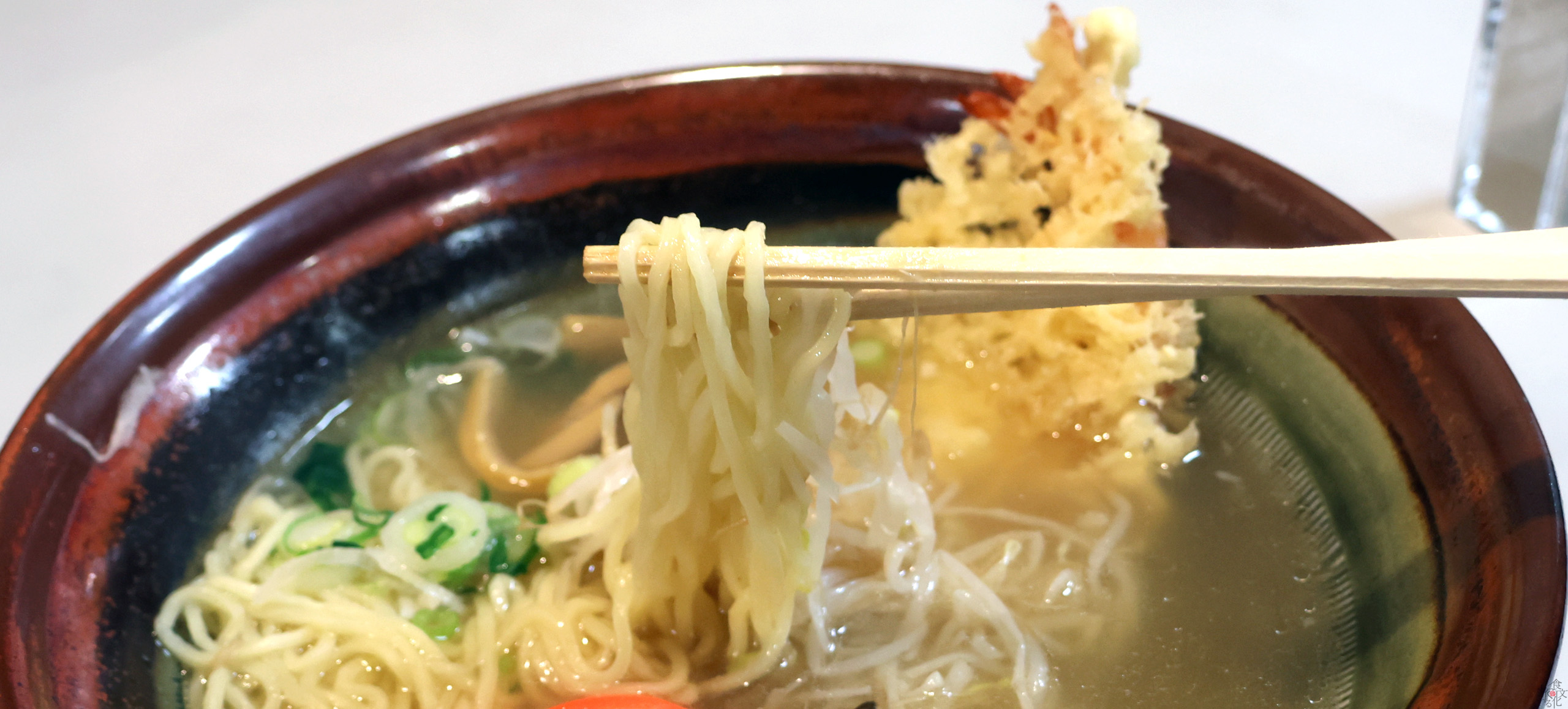 まずは、古くから天ぷら中華を扱う老舗食堂「志のだや」を訪れた。ラーメンと言えば、チャーシューがつきものだが、海老の天ぷらと中華麺がこれほどまでに相性がいいというのは驚きでもある。その橋渡しをするのがあっさりとしたスープの存在だ。薄味で透明度が抜群で、ラーメンスープというよりは、そばだしに近い味わいだ。そこに海老天の衣がとろけると絶妙な味わい。